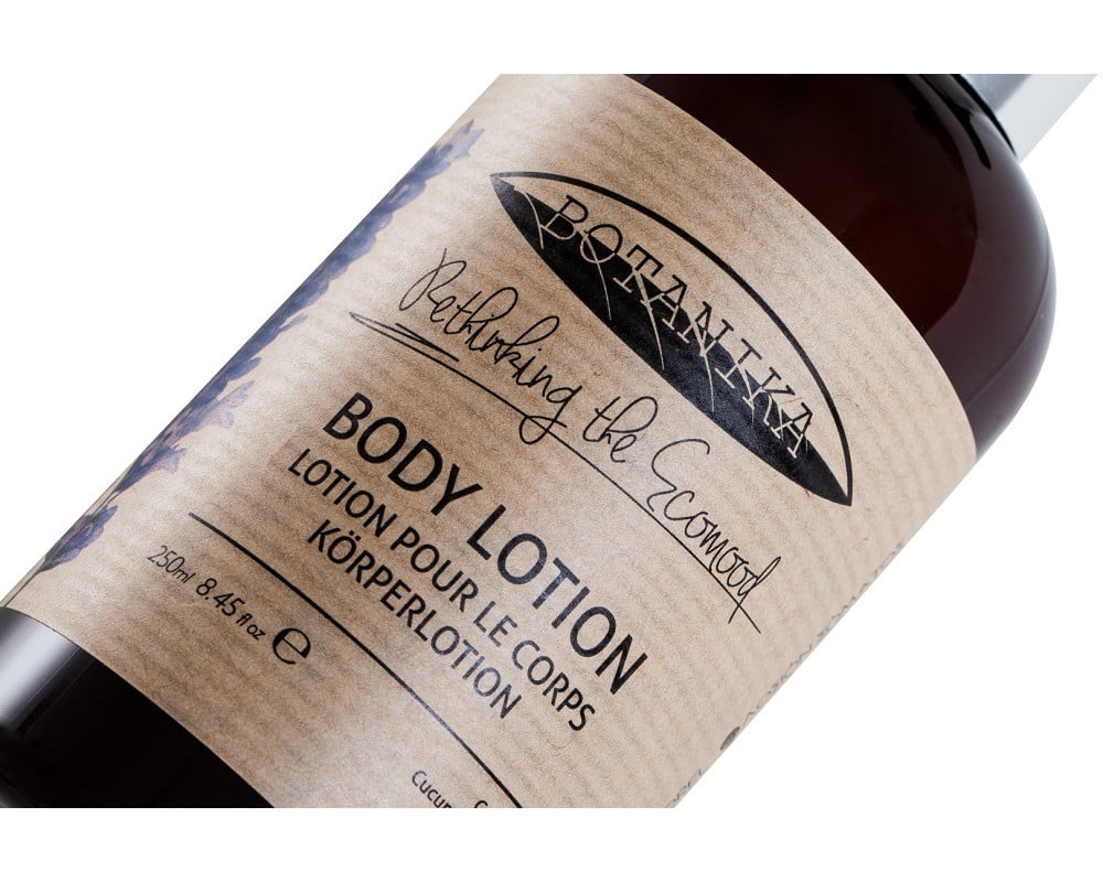 ilingrijeste, hidrateaza, prin prisma balsamului de par). Crema de corp Botanika cu parfum de Ceai Verde si extract de castravete, care adauga stralucire si extra-hidratare tenului. Sticlutele gamei Botanika Lavanda sunt prezentate in formula de 250 ml (sticla este material PET, reciclabila si astfel grijulie cu mediul inconjurator, de culoare maronie, tip “brown pharmaceutical” – specifica mediului farmaceutic care se remarca prin imaginea de igiena si curatenie pana la cel mai mic detaliu. Este genul de sticla care aminteste de farmacii, culoarea maronie –brown pharmaucetical este una specifica sticlelor de farmacie, ceea ce denota atentie pentru detalii si exigentele produselui, asemanatoare farmaciilor. Capacul sticlutei este de culoare aurie, din material aluminiu, un capac