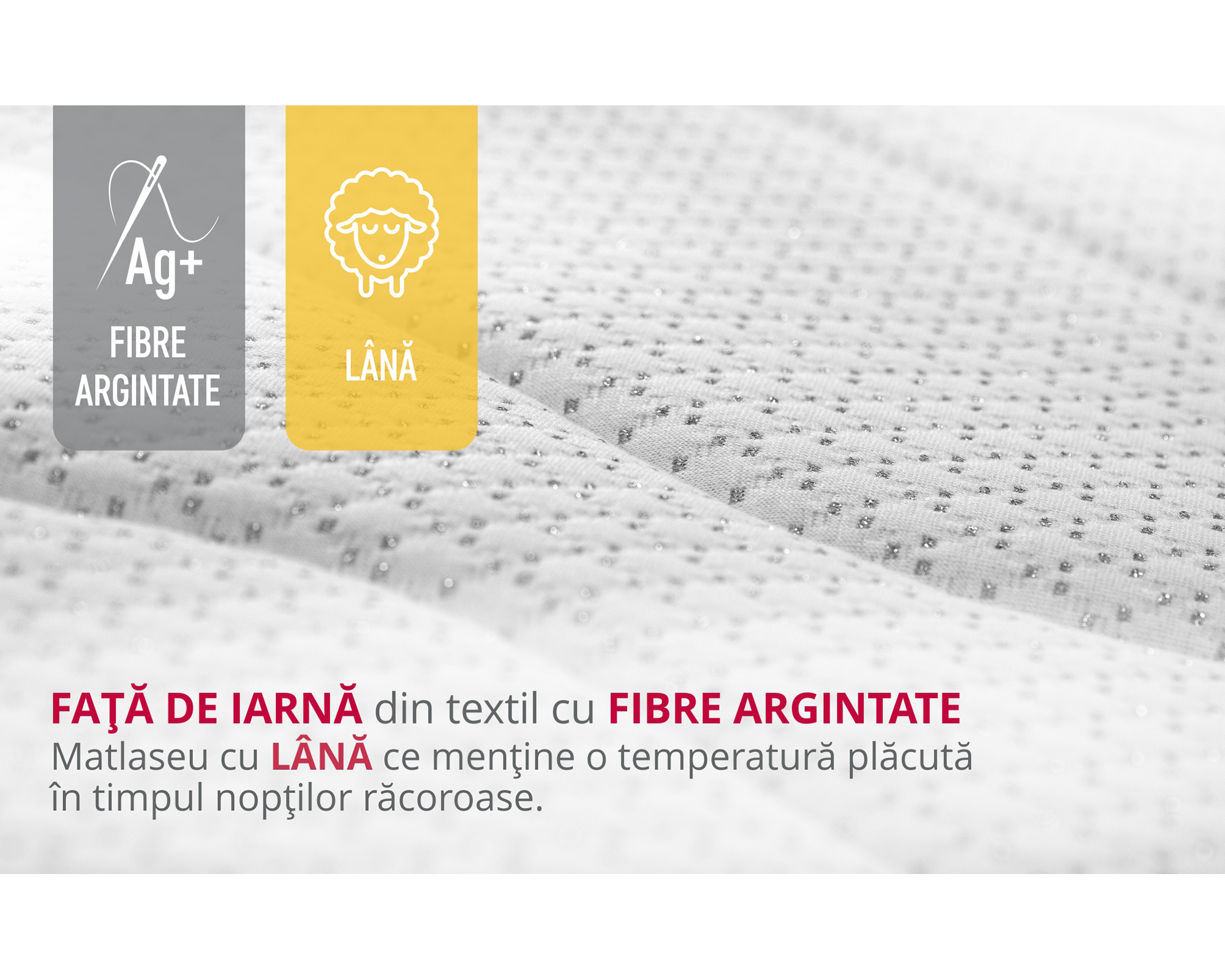 Combina calitatile ortopedice ale spumei elastice Green Form HD® cu proprietatile ergonomice ale materialelor naturale cu efecte benefice asupra organismului, asigurand astfel confortul optim pentru un somn de calitate. Salteaua este conceputa cu materiale de cea mai buna calitate, fiind prevazuta cu 2 fete: de vara si de iarna. Fata de vara este realizata din textil Ice Touch cu fibre reci Ice Fiber, ce mentine o temperatura constanta in timpul noptilor calduroase de vara. Fata de iarna este realizata din textil cu fir argintat, matlasat cu fibre de bambus si lana calduroasa Merino.