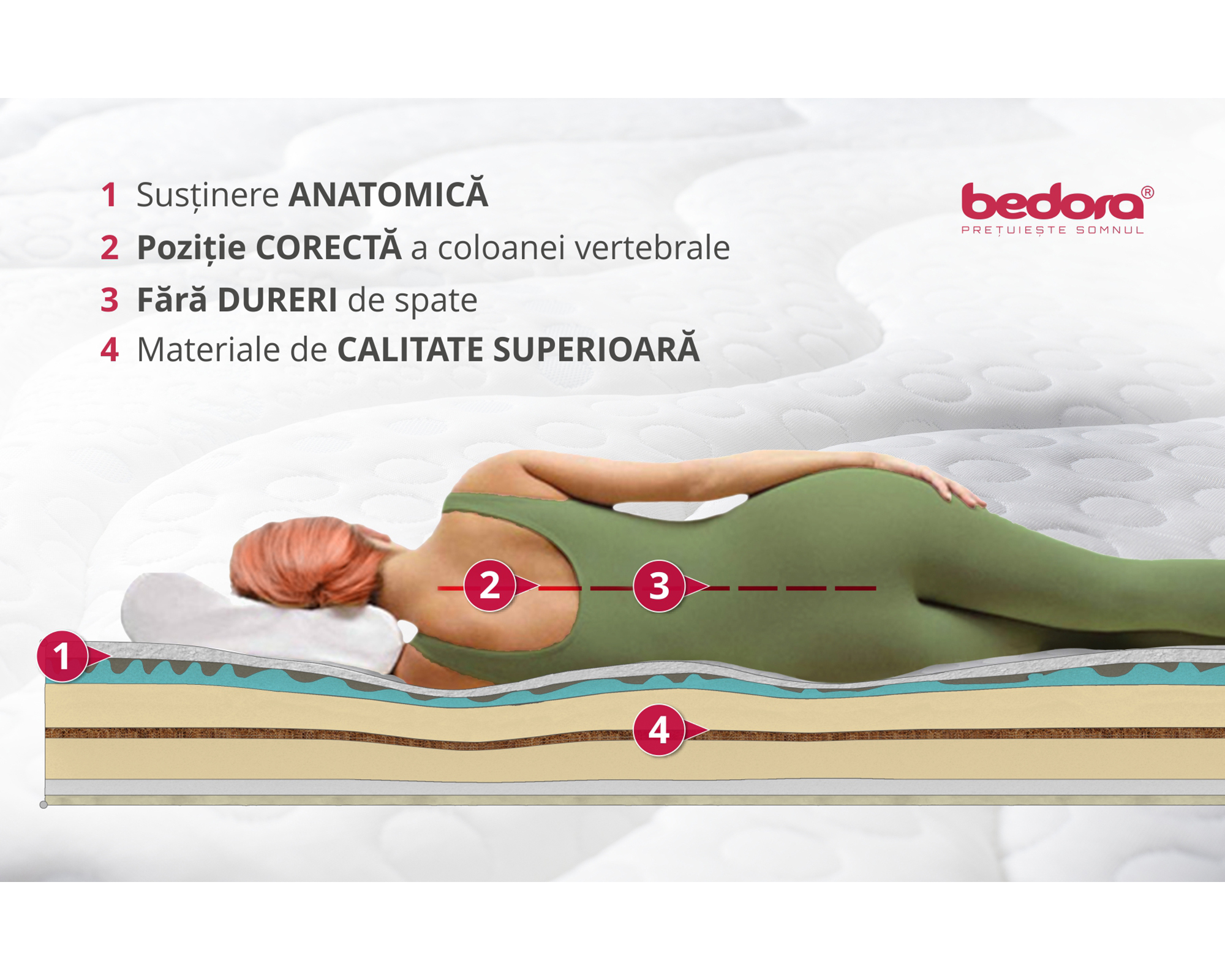 Lana: Datorita calitatilor de termoreglare a temperaturii si umiditătii este ideala pentru utilizare atat iarna, cat si vara. Confortul oferit de produse care contin lana reduc stresul termic din timpul somnului prin reglarea temperaturii corpului. Pentru un plus de confort au fost adaugate spuma Memory. Saltea Ortopedica Bedora Ice Touch contine: