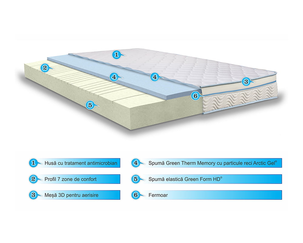 Combina calitatile termice ale spumei memory foam cu cele ale spumei memory cu particule reci Arctic Gel, pentru un confort ortopedic si termic excelent. Salteaua este conceputa din materiale de calitate superioara. Husa moale la atingere este matlasata pe partea superioara cu un strat de 2 cm din spuma Green Therm Memory cu particule reci Arctic Gel®. Baza saltelei din spuma elastica Green Form HD® cu celulatie deschisa, aerisita, profilata cu 7 zone de confort confera o sustinere anatomica a corpului si o pozitie corecta, sanatoasa a coloanei in timpul somnului. Stratul suplimentar de 3 cm din spuma Green Therm Memory cu particule Arctic Gel® aplicat bazei impreuna cu cel din husa superioara se muleaza pe corp eliminand punctele de presiune in timpul somnului pentru a relaxa muschii si a asigura o circulatie sangvina sanatoasa.