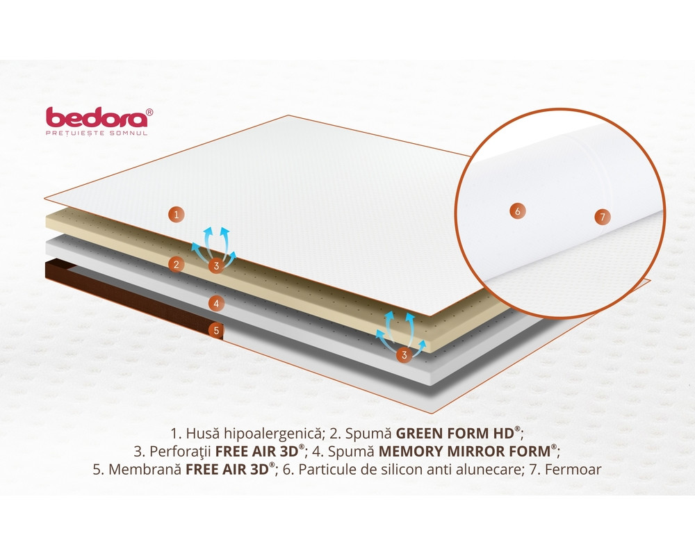 Structura Topper Bedora Leon Dual Confort este formata din doua straturi de spuma poliuretanica: un strat din spuma elastica Green Form HD® cu celulatie deschisa ce asigura o sustinere anatomica si un strat de spuma Memory Mirror Foam® 7 zone de confort care se muleaza pe corp eliminand punctele de presiune in timpul somnului pentru a relaxa muschii si a asigura o circulatie a sangelui corespunzatoare.